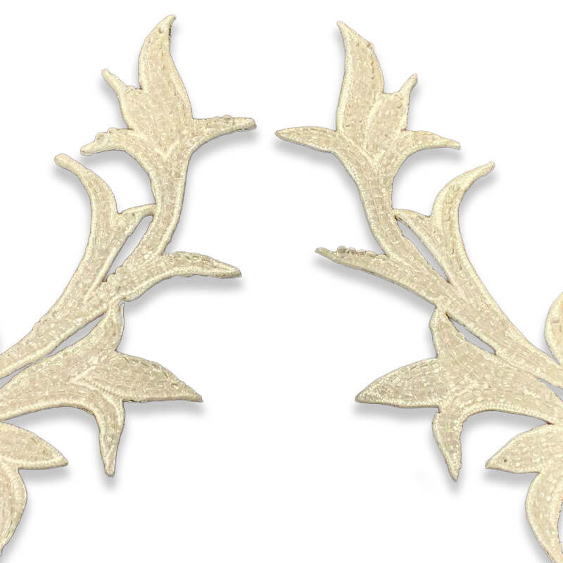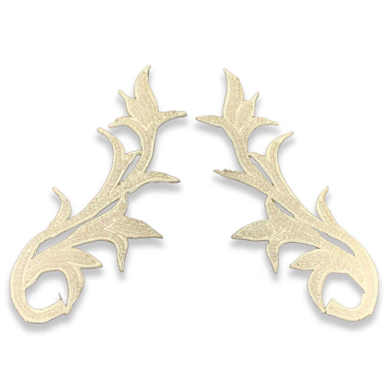Esta pareja de apliques bordados en color blanco de 11 cm de altura está diseñada para aportar equilibrio, elegancia y detalle en prendas de confección profesional. Su formato simétrico permite trabajar composiciones limpias y armónicas, facilitando su aplicación en zonas donde el diseño requiere continuidad visual y coherencia estética.