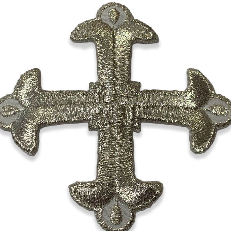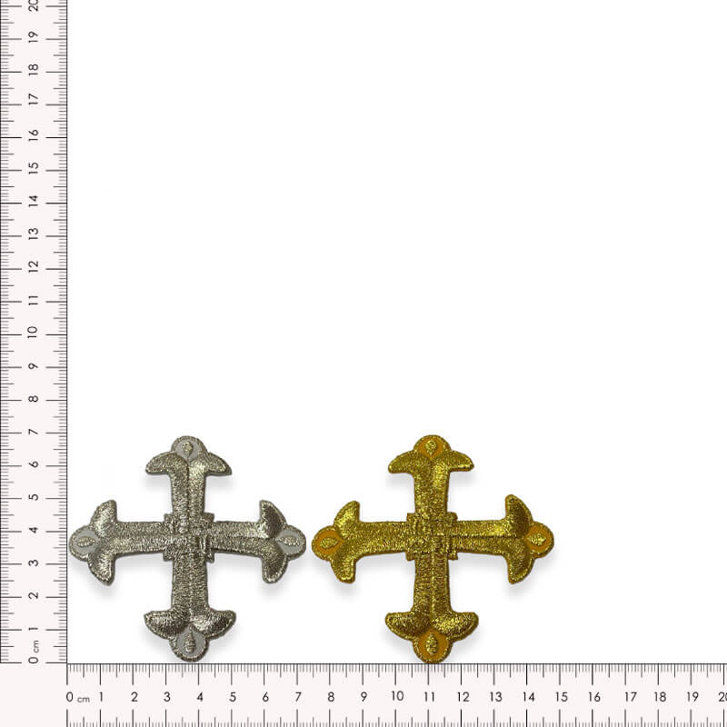 El diseño combina líneas rectas con terminaciones curvas que suavizan la forma de la cruz, generando un resultado visual armonioso y muy versátil. El bordado se realiza con hilo metalizado que aporta un brillo discreto pero elegante, permitiendo que el aplique destaque sin resultar excesivo. Gracias a su tamaño contenido, puede integrarse fácilmente en distintos estilos de confección.