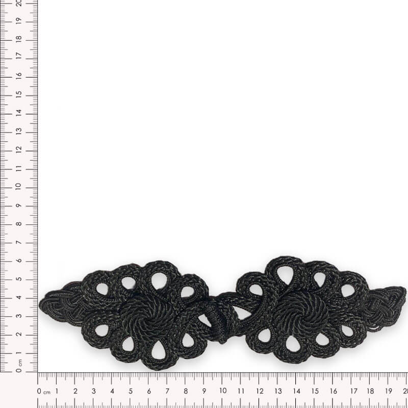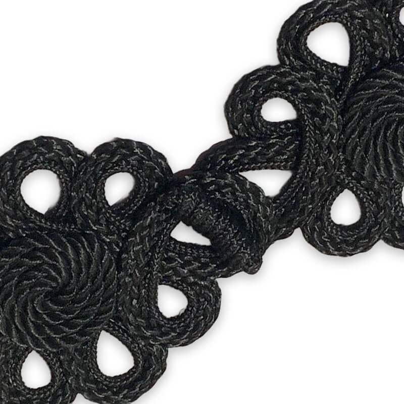 Este alamar está especialmente indicado para trajes de Moros y Cristianos, comparsas, vestuario histórico, recreaciones teatrales y uniformes ceremoniales. Su acabado en negro permite integrarlo en composiciones sobrias o contrastarlo sobre tejidos metalizados, terciopelos o brocados.