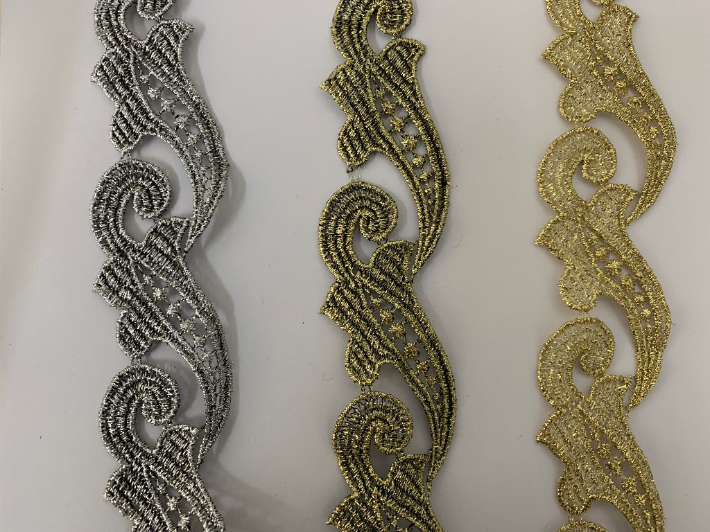 <p>Artículo: Galon Guipur</p> <p>Ref: 264.51060.9</p> <p>Tres colores: Oro , Plata , Oro/Negro</p> <p>14 mt +/- por pieza</p>